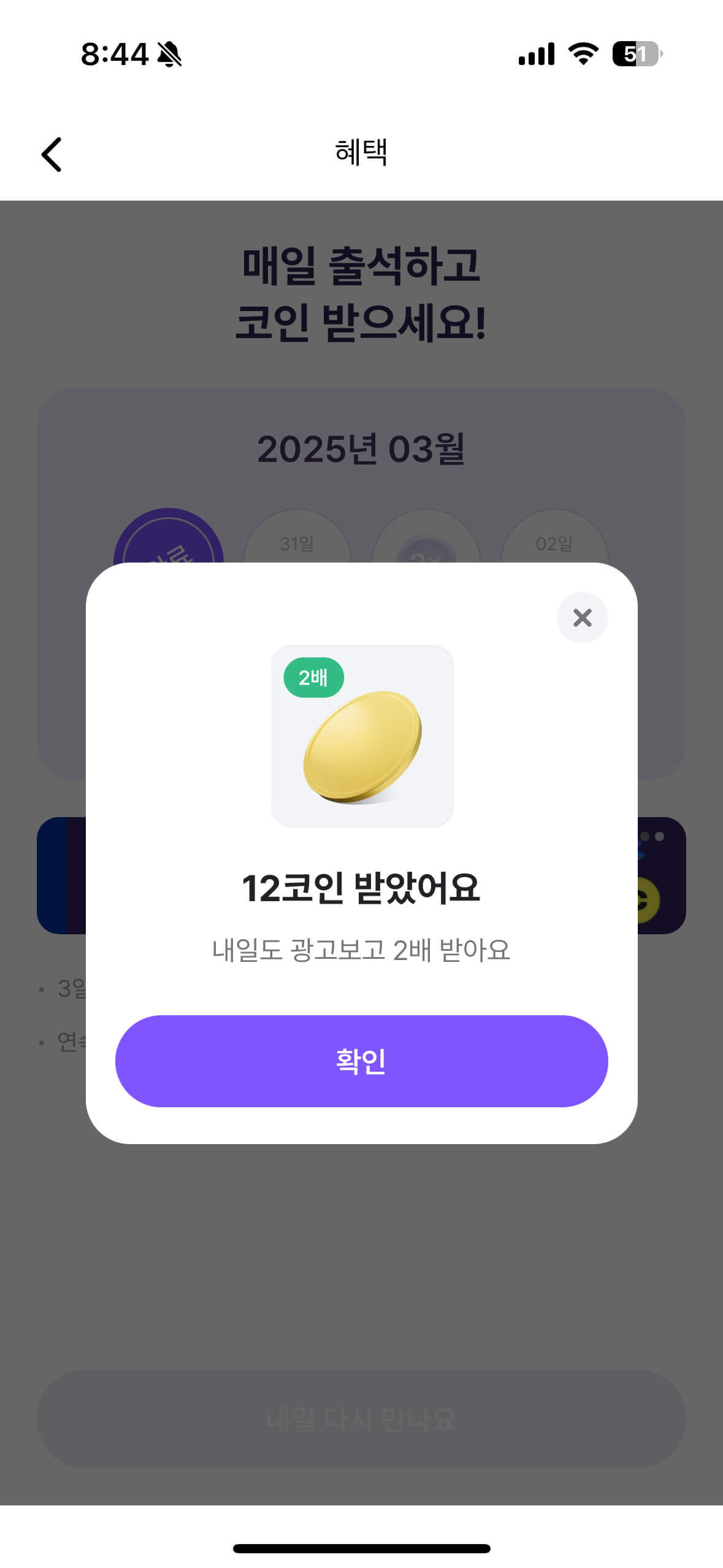 오늘은 2배 출석 보상 이벤트가 있어서 12코인을 받았어요!