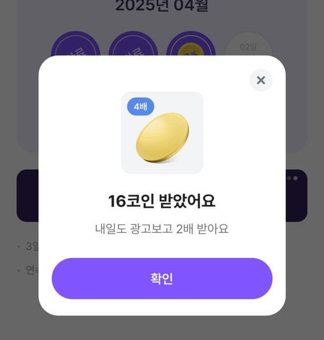 오늘도 출석 성공! 출석 4배 이벤트가 떠서 광고까지 보고 16코인 받았어요 🎉 매일 출석하면 정말 무시 못 할 포인트가 쌓이더라고요.
