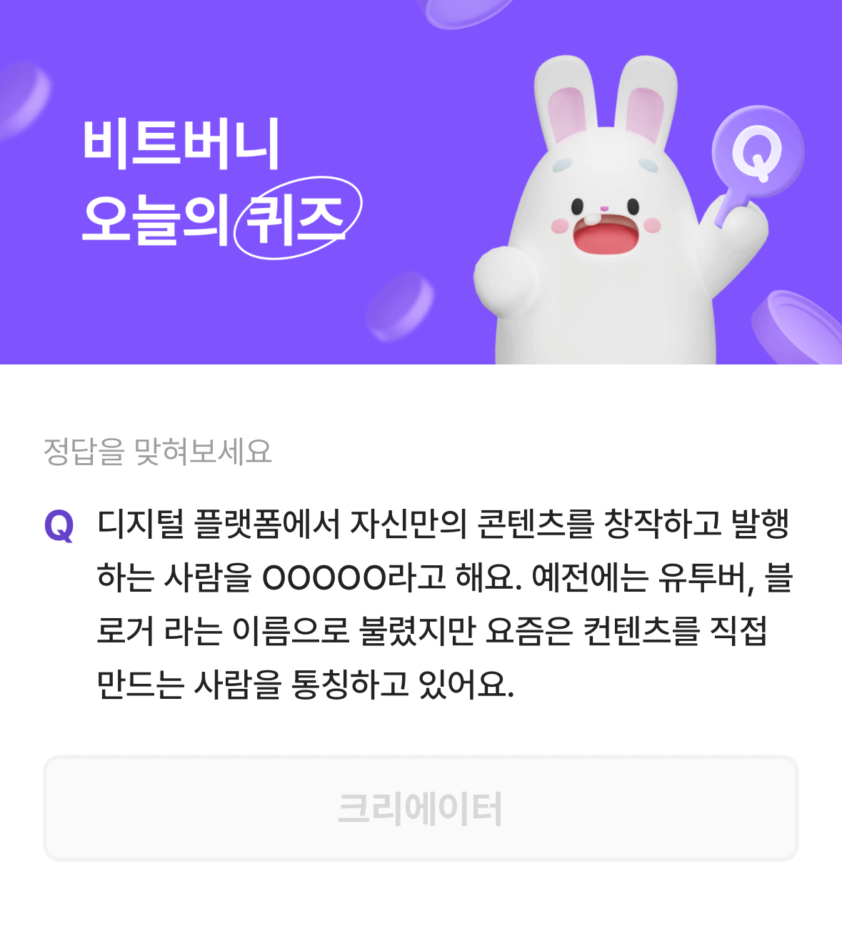 오늘의 비트버니 퀴즈 문제는 '디지털 플랫폼에서 자신만의 콘텐츠를 창작하고 발행하는 사람을 OOOOO라고 해요.